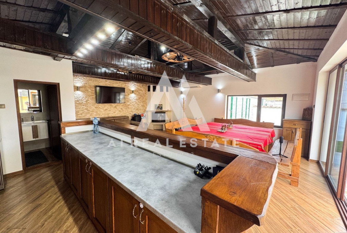 Застроената площ е 150 кв.м и е функционално разпределен в 5 стаи, от които 3 комфортни спални, просторна всекидневна с кухня и впечатляващо закрито барбекю , с площ от 70 кв.м, оборудвано с кухня, камина и собствен санитарен възел.